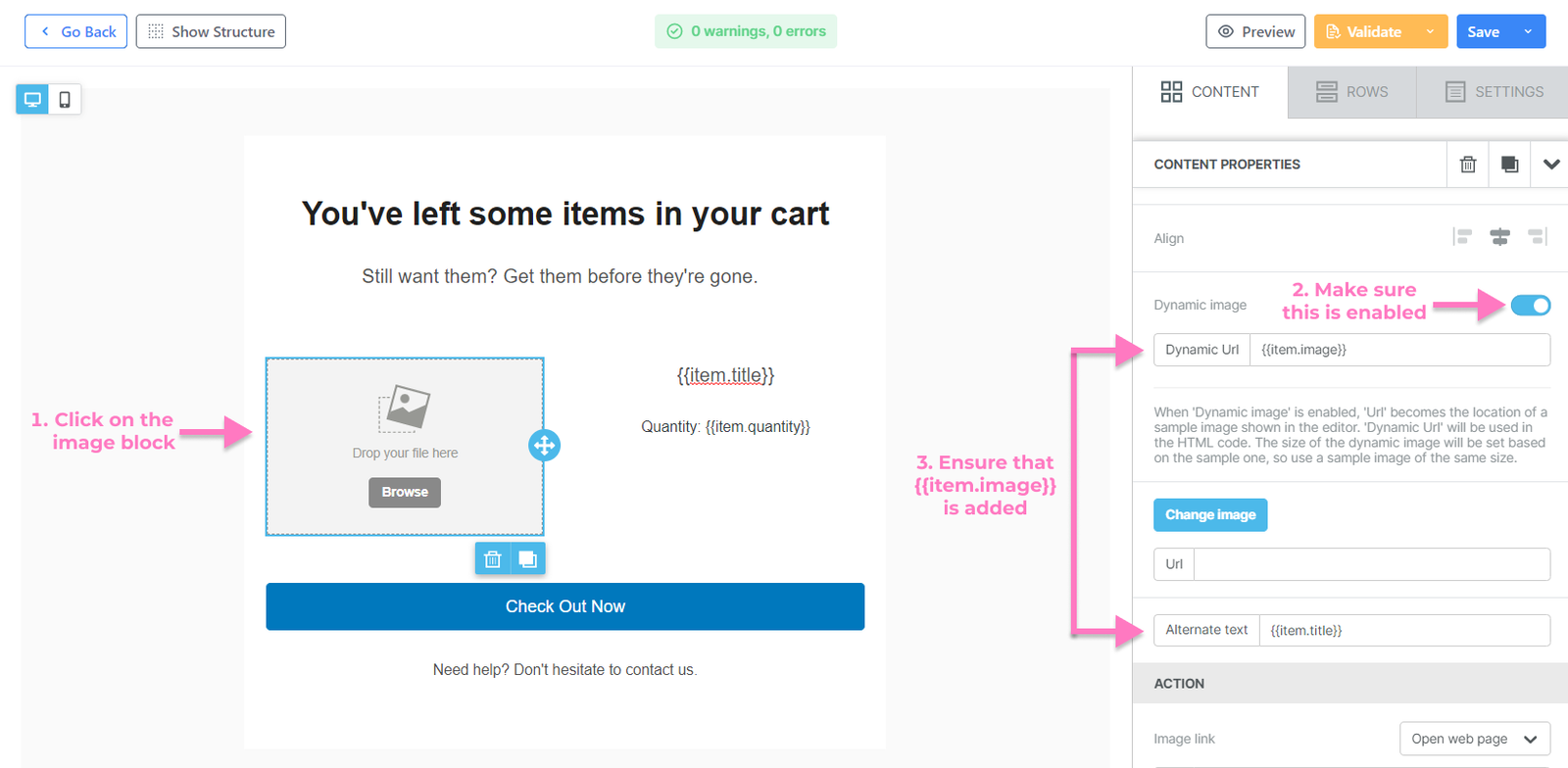 - Add {{item.image}} to the Dynamic URL and Alternate text boxes.