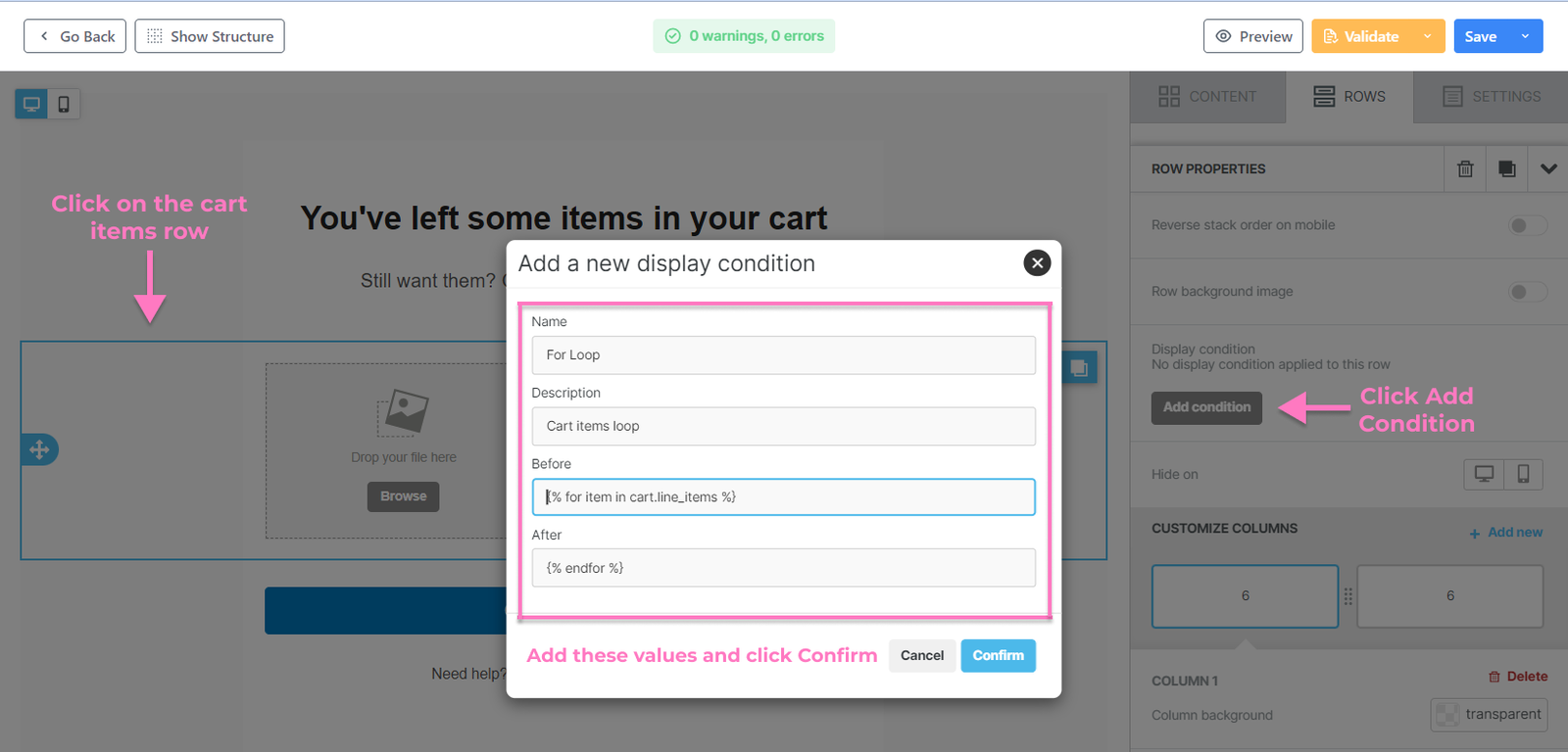 Click on the cart items row and ensure that the For Loop condition for cart items is added to the Display Condition. If the For Loop condition is not added, follow these steps: