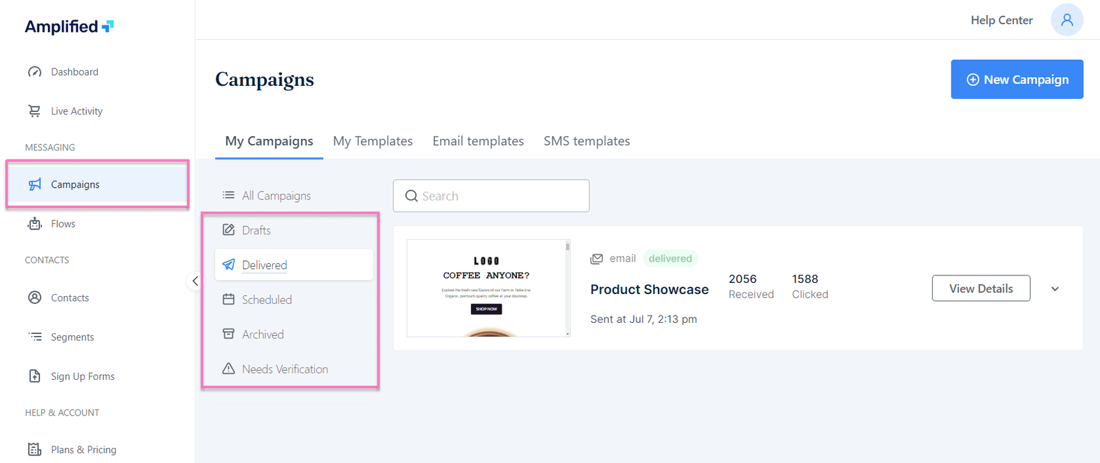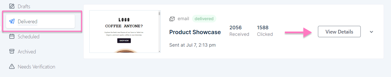 These are all the campaigns that were successfully delivered to their intended recipients. As soon as they are delivered; you can track how many opens and clicks it got, the number of deliveries, unsubscription rates, and even the attributed revenue. Those metrics can be viewed by going to the Delivered section and clicking View Details on the right side of the campaign.