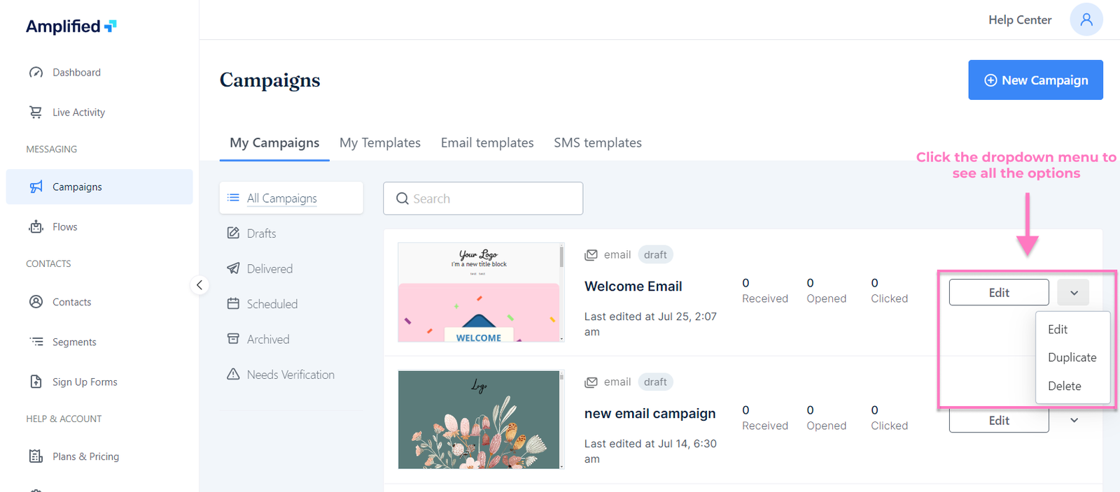 Duplicating a campaign is useful when you want to quickly create a new version of the same campaign. To duplicate a campaign, click Duplicate in the drop-down menu on the right-hand side of the campaign. A duplicate copy of your campaign will be created in the Drafts section.