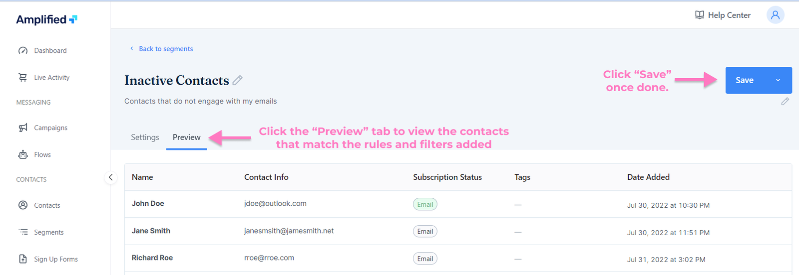 How to set up a segment - Click on the “Preview” tab to view the contacts that match the rules and filters added.