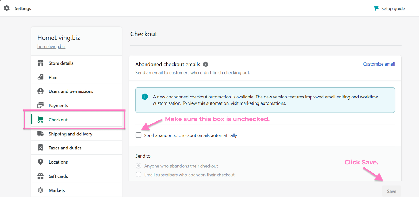 Uncheck the box labeled Automatically send abandoned checkout emails
