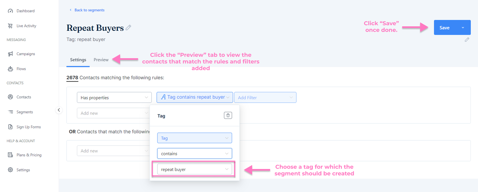 How to add the tag, preview, and save the segment