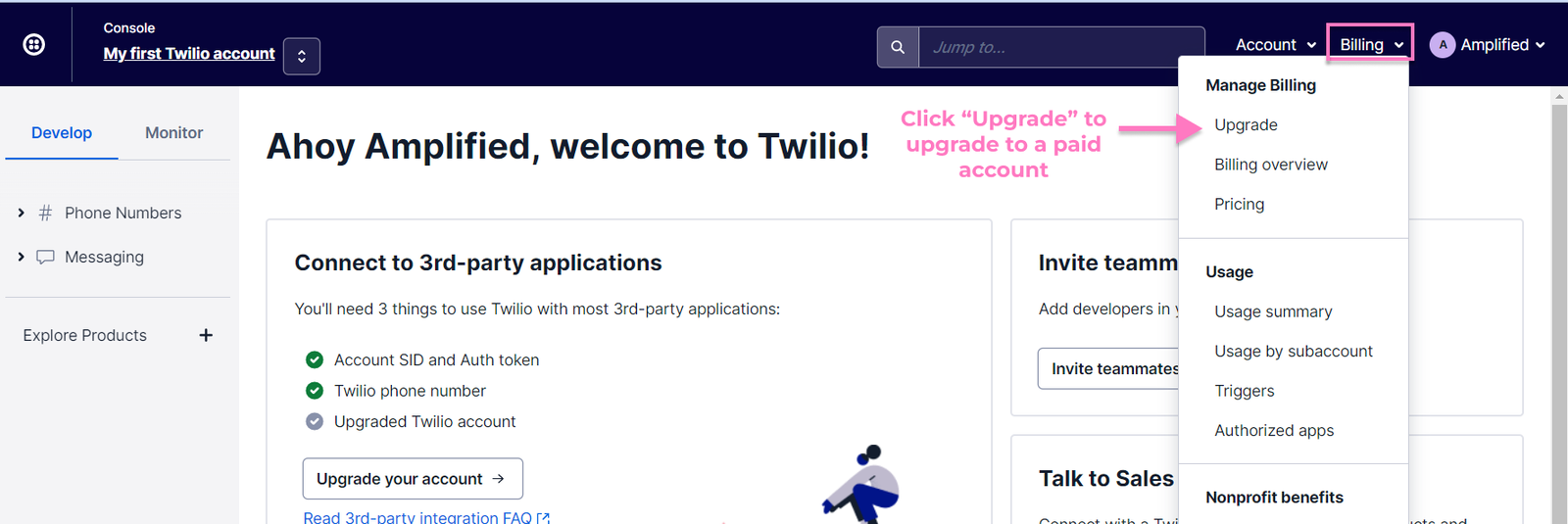 - In your Twilio console, select Billing from the top right menu and click "Upgrade".