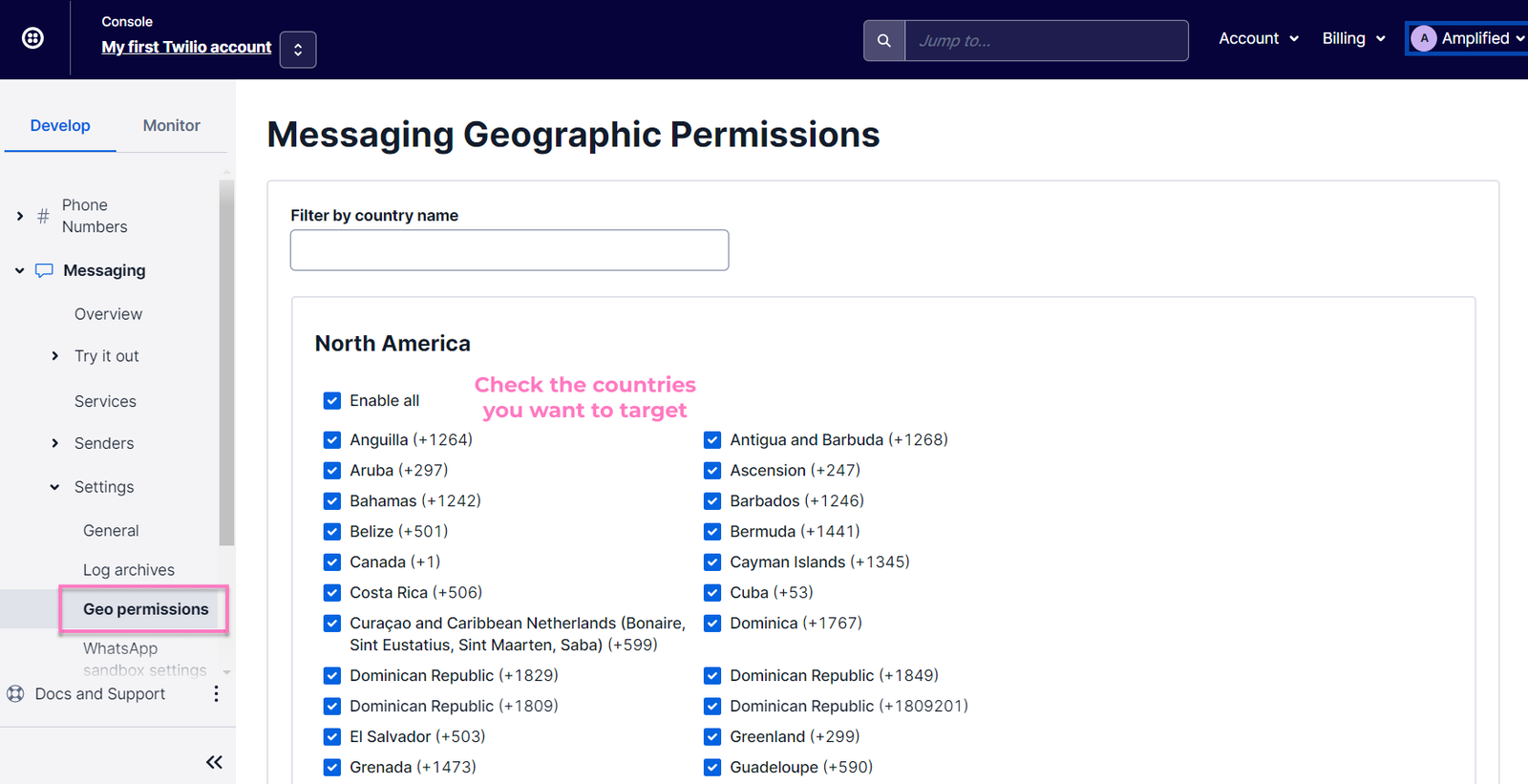 - In your Twilio console, go to Messaging > Settings > Geo Permissions