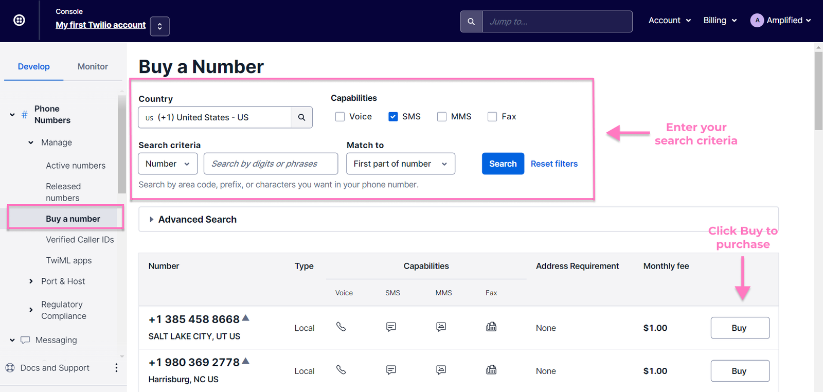 Enter your search criteria, and Twilio will display several numbers to choose from. Click “Buy” to purchase a phone number